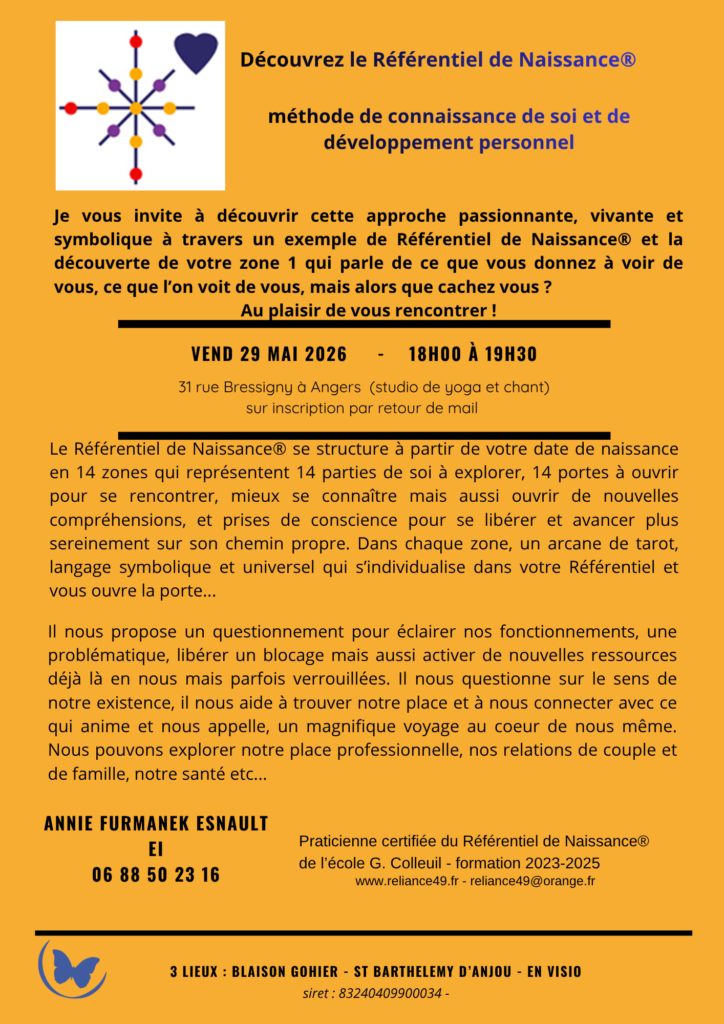 =>Je vous invite à une soirée découverte du Référentiel de Naissance®, méthode de connaissance de soi passionnante et vivante :