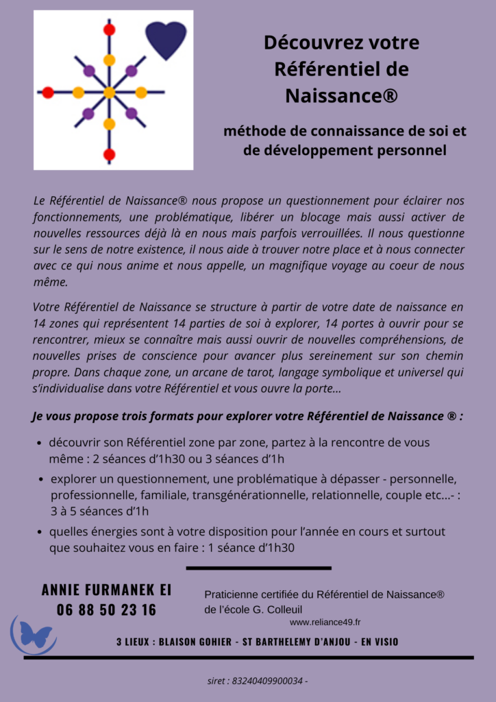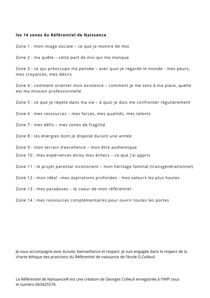 » Le Référentiel de Naissance® est une méthode de connaissance de soi et de communication créée par le chercheur et philosophe Georges Colleuil à partir des années quatre-vingt. En harmonie avec la troisième étape de développement de cet outil, le Référentiel de Naissance évolue progressivement vers une nouvelle désignation : le « Référentiel Projectif ».